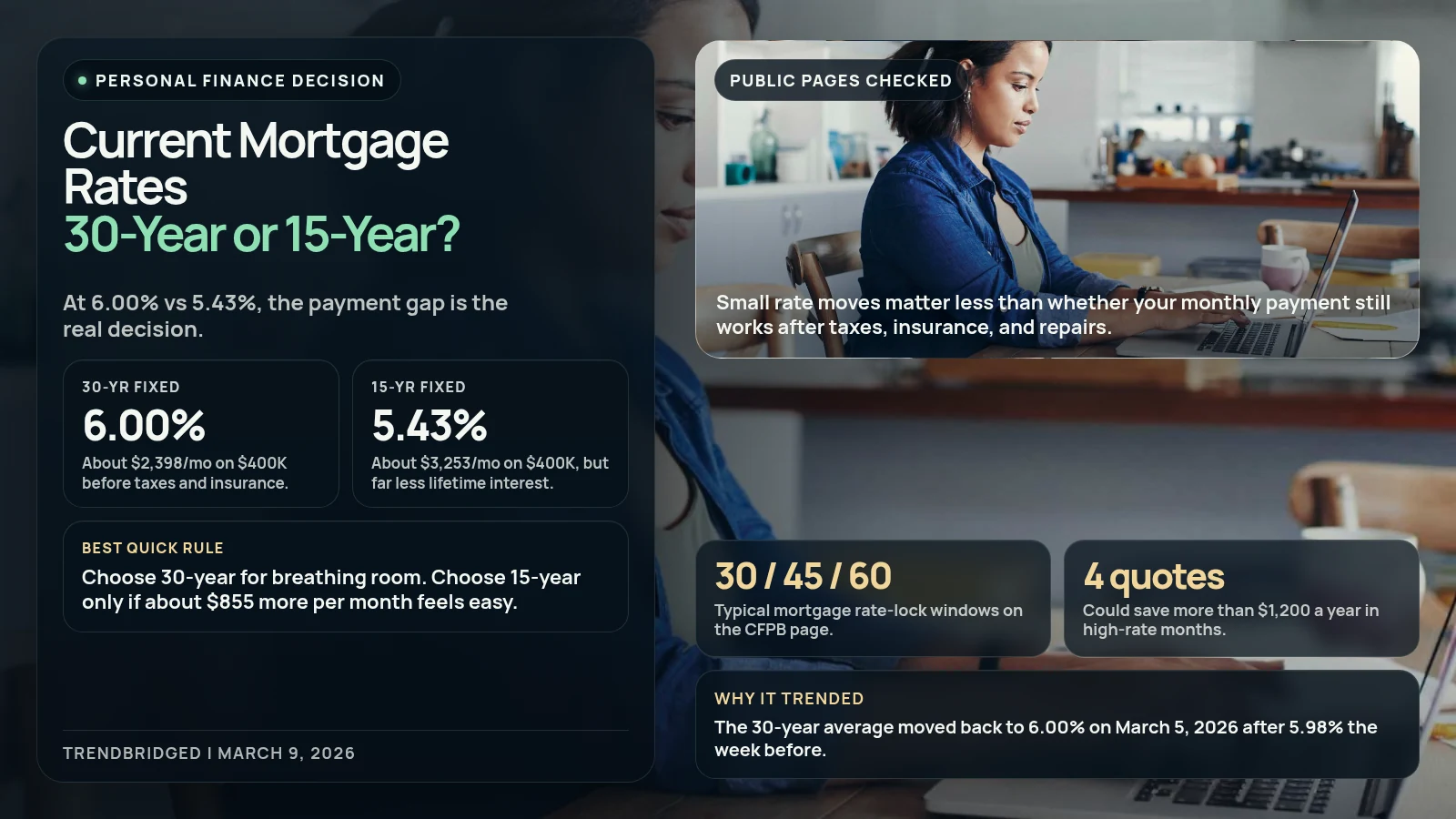 A mortgage decision feels different when the benchmark is sitting on the line. This guide answers one specific question: at current mortgage rates, should you choose a 30-year fixed mortgage or a 15-year fixed mortgage? On March 9, 2026, the lower-regret answer for most buyers is the 30-year unless an extra $855 per month on a $400,000 loan feels comfortable enough that you would gladly trade it for about $278,000 less interest over the life of the loan.